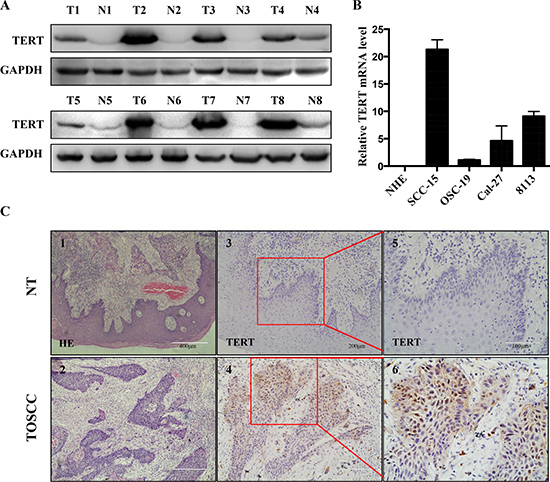 Figure 1: hTERT expression in squamous cell carcinoma tissues and cell lines. (A) The relative protein expression of hTERT was detected by western-blotting analysis in paired clinical squamous cell carcinoma tissue (T) and adjacent non-tumor tissues (N), with each pair obtained from the same patient. (B) RT-PCR analysis of expression of hTERT in different oral squamous cell lines (normal human epithelial (NHE) cells, SCC-15, OSC-19, Cal-27 and 8113). The results are representative of at least 3 replicates. (C) HE (1, 2) and immunohistochemical staining (3–6) of paraffin-embedded sections in control group (upper panel) and tongue carcinoma (lower panel) were performed using an antibody against TERT using the streptavidin peroxidase (SP) method. Images 1 and 2, 100 ×magnification, images 3 and 4, 200× magnification, and images 5 and 6, boxed areas in 3 and 4, 400× magnification.