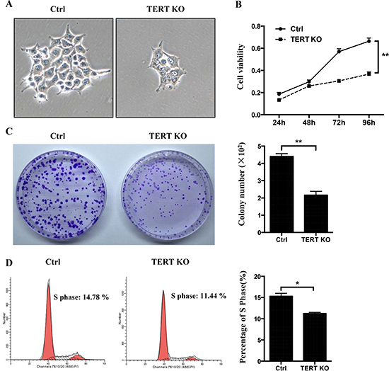 Figure 3: The effects of hTERT on the cell growth in SCC-15 cells. (A) Morphological changes between the scramble cells and hTERT−/− cells. (B) CCK8 assays were used to determine the cell viability after treatment of the hTERT−/− cells. (C) The clone numbers of SCC-15 compared with the hTERT−/− cells. Representative pictures (left panel) and a summary graph (right panel) are shown (n = 3).(D) Effects of knockout of hTERT on cell cycle progression. Representative pictures (left panel) and a summary graph (right panel) are shown (n = 3). *P < 0.05; **P < 0.01 vs Ctrl.
