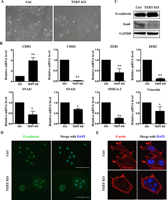 Figure 5: Knock-out hTERT inhibits EMT in SCC-15 cells. (A) Morphological changes in cells with hTERT knockout compared to control cells. Knockout of hTERT resulted in greater cell-cell contacts when compared with scramble control cells. (B) mRNA levels of several EMT makers in scramble and the hTERT−/− cells (n = 3). *P < 0.05; **P < 0.01. (C) Protein levels of EMT markers, E-cadherin and SNAIL in SCC-15 stable cells assessed by western blotting. (D) Fluorescence microscopic staining of e-cadherin (green) is indicated in scramble and knockout cells. Nuclear DNA was stained with DAPI (blue). Scale bar: 100 um. Data were collected in this set of figures from a representative of at least 3 independent experiments. (E) Immunofluorescent staining of F-actin using phalloidin–fluorescein isothiocyanate in scramble and the hTERT−/− cells.