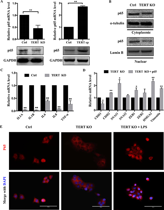 Figure 6: Knockout of hTERT attenuates NF-κB signaling pathway. (A) mRNA and protein levels of the NF-κB p65 subunit in SCC-15 cells of hTERT over-expression and knockout. (B) Knockout hTERT reduced cytosolic and nuclear P65 levels. Cells lysates were prepared from cytosolic and nuclear fractions. P65, GAPDH (cytosolic control) and Lamin B (nuclear control) were analyzed by western blotting. (C) The mRNA levels of the NF-κB-dependent gene in SCC-15 stable cells of hTERT knockout. (D) Knockout cells were transfected with Flag-p65 or PCMV-Flag controls as indicated. At 48 h later, cells were treated by mRNA extraction and quantitative PCR. Levels of relative EMT mRNA expression for the indicated genes are shown. (E) LPS rescues knockout hTERT-dependent inhibition of NF-κB activation. The SCC-15 cells were treated with or without LPS (5 mg/ml) for 4 h. The localization of p65 in SCC-15 cells was determined by immunofluorescence staining. Scale bar: 100 um. Data were collected in this set of figures from a representative of at least 3 independent experiments. *P < 0.05; **P < 0.01.