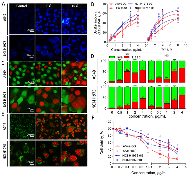 Figure 2: A549 and NCI-H1975 cell PAH uptake, viability, and death phenotype. Representative fluorescent microscopy images of PAH uptake (A) Response curves showing PAH uptake based on PAH concentration (left) and exposure duration (right) (n=3). *p<0.05 compared to 0 G cells (B) Representative fluorescent microscopy images of live/dead cells detected using calcein-AM and PI (C) Histograms of live/dead cells as determined by flow cytometry (n=3) (D) *p<0.05, **p<0.01 compared to controls; #p<0.05 compared to untreated 10 G cells. Representative fluorescent microscopy images showing cell death phenotypes using an apoptosis/necrosis staining kit (E) Dead 0 G cells exhibited classic apoptosis morphological features, including pyknosis, chromatin condensation, and karyorrhexis. Some dead 10 G cells presented necrotic characteristics, such as oncosis and cell membrane rupture. Cells were treated with PAH extract for 24 h, and cell viability was detected via MTT assay (n=3) (F) *p<0.05 compared to controls (0.5% DMSO-treated cells).