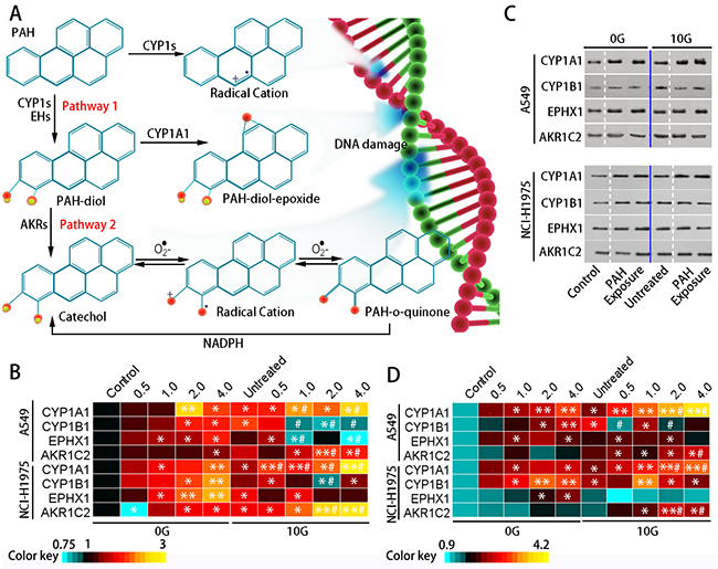 Figure 3: PAH metabolic pathways and XME levels. Metabolic activation of PAHs (A) Pathway 1: CYP1s activate PAHs to form PAH-epoxides on the bay region benzo-ring; subsequent EPHX1-mediated hydrolysis results in PAH-dihydrodiol (PAH-diol) formation. The dihydrodiols can undergo a secondary epoxidation to form bay region PAH-diol-epoxides. Pathway 2: Members of the AKR superfamily can transform PAH-diol to the corresponding PAH-o-quinone. Heatmap showing relative (fold change over controls) CYP1A1, CYP1B1, EPHX1, and AKR1C2 expression in the two groups as determined via qRT-PCR (n=3) (B) Representative western blotting results showing CYP1A1, CYP1B1, EPHX1, and AKR1C2 levels (C) Heatmap showing relative (fold change over controls) CYP1A1, CYP1B1, EPHX1, and AKR1C2 protein levels (n=3) (D) *p<0.05, **p<0.01 compared to controls; #p<0.05 compared to untreated 10 G cells.