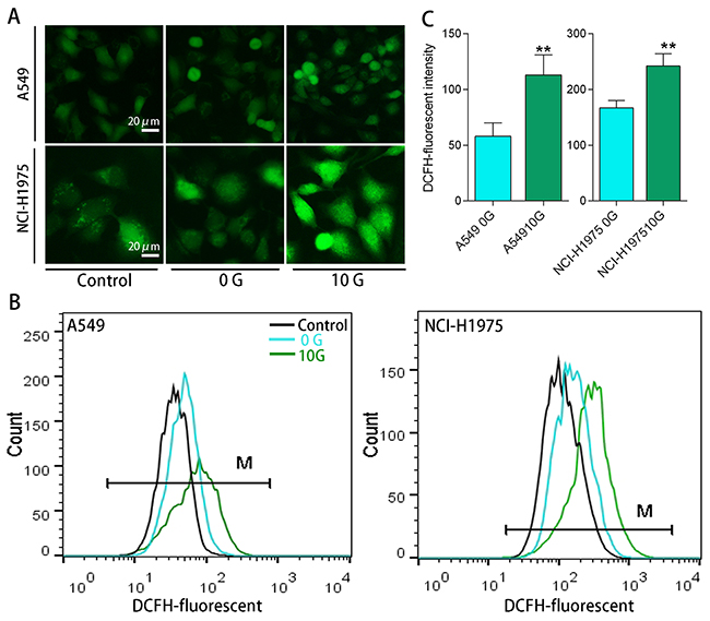 Figure 4: Intracellular ROS levels determined using an H2DCFDA ROS probe. Representative fluorescent microscopy images showing intracellular ROS in A549 and NCI-H1975 cells (A) Representative DCFH fluorescence intensities as determined using flow cytometry (B) DCFH fluorescent intensity analysis results (n=3) (C) **p<0.01 compared with 0 G cells.