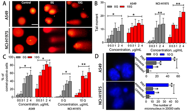 Figure 5: DNA damage and genomic instability assessments. Representative DNA comet images in A549 and NCI-H1975 cells after PAH exposure (A) Controls were almost tail-negative. When cells containing damaged DNA were subjected to electrophoresis, fragmented DNA migrated towards the positive electrode, away from the nucleus. Statistical tail moment values for treated cells (n=3) (B) Percentages of tail-positive cells (n=3) (C) Representative micronucleus images (left), and numbers of micronuclei in treated and untreated samples (right; 2x103 cells/sample) (n=3) (D) *p<0.05, **p<0.01 compared to controls.