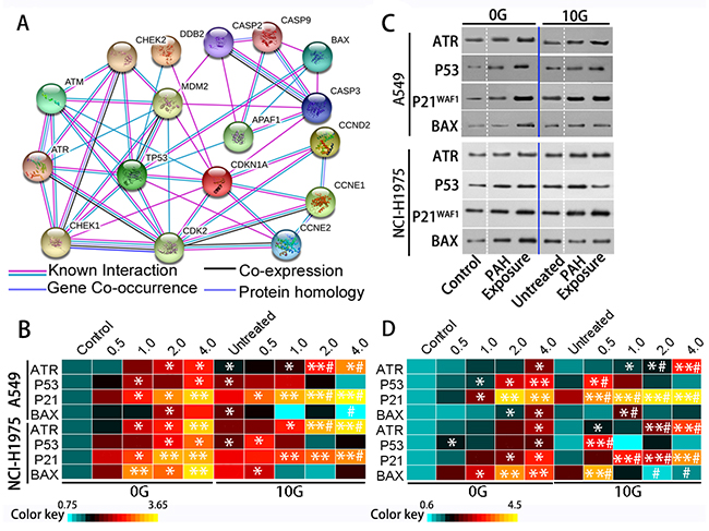 In response to genotoxic stresses, the DDR is indispensable for maintaining genomic integrity [31]. Interference with the DDR leads to DNA repair failure and increased genomic instability. Figure 6A shows a simplified schematic representation of the DDR networks built using STRING v10. Major DDR regulators include the phosphoinositide 3-kinase (PI3K)-related protein kinases, such as ataxia-telangiectasia mutated (ATM) and ATM and RAD3-related (ATR). ATM functions in response to rare occurrences of double-strand breaks (DSBs), while ATR is activated in response to many types of DNA damage [14]. P53 and its downstream proteins regulate key processes in cell defense following DNA damaging agent exposure, including DNA repair, cell cycle progression, and apoptosis [32].