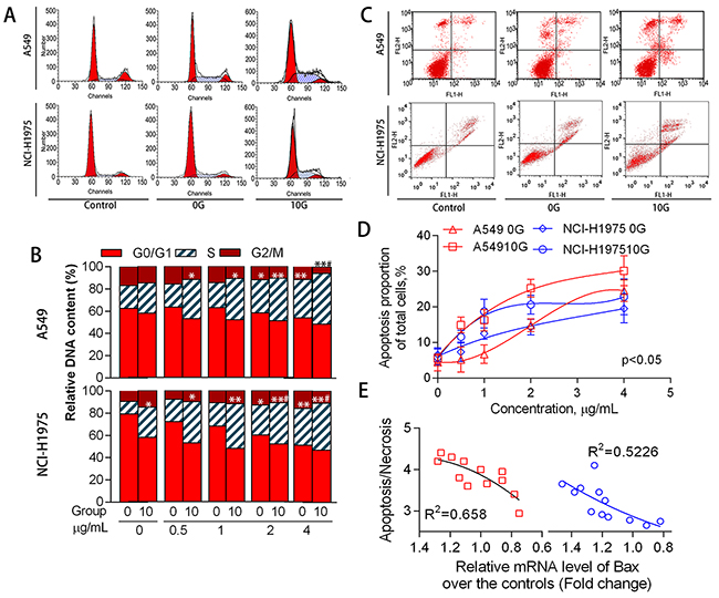 Figure 7: Cell cycle distribution and apoptosis as mediated by acute and chronic PAH exposure. Representative cell cycle distributions (A) and histograms (B) for the different treatment groups (n=3). Representative cell apoptosis phenotypes as determined via flow cytometry (C) Proportions of apoptotic cells at different PAH concentrations (n=3) (D) Relationship between Bax expression and apoptosis/necrosis in 10 G cells (E) *p<0.05, **p<0.01 compared with the controls.