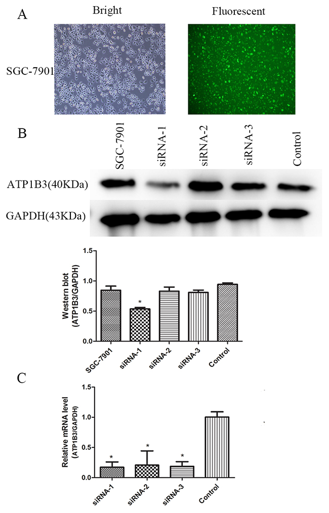 Figure 3: ATP1B3 expression was knocked down by transfection with ATP1B3-siRNA in SGC-7901 cells. (A) Representative photomicrographs of bright fluorescence in SGC-7901 cells were obtained at a magnification of 100x. At 48 h after infection, approximately 50% of the cells expressed FAM at the time points as determined by fluorescence microscopy. (B) Western Blot measured ATP1B3 protein expression in SGC-7901 cells and in cells transfected with siRNA1, siRNA2, siRNA3, or si-NC. It showed that ATP1B3 siRNA1 was the most efficient knockdown sequence compared with the other siRNAs. *P<0.05 compared with SGC-7901 and Control cells. (C) qRT-PCR assay analysis of ATP1B3 mRNA knockdown efficiency using siRNA1, siRNA2, siRNA3 and si-NC in SGC-7901 cells. *P<0.0.1 vs. Control. All of three siRNA fragments demonstrated good knockdown efficiency with respect to ATP1B3 mRNA, and siRNA1 had the highest interference efficiency from the average value.