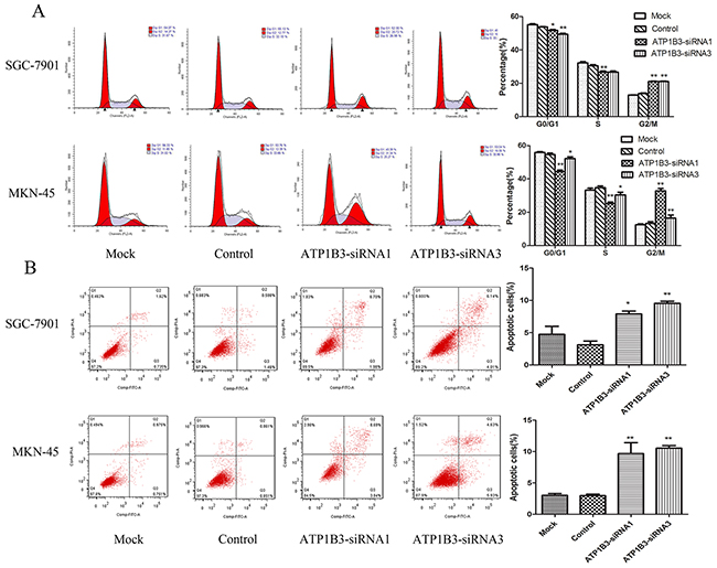 After 48 h of transfection with ATP1B3-siRNA or Control siRNA, the cells were harvested and washed with binding buffer, resuspended in staining buffer, and then incubated with Annexin V-PI (BD, USA) at room temperature in the dark for 15 min. After incubation, the cells were analysed using a FACS Calibur Flow Cytometer (BD Biosciences, USA). All experiments were performed in triplicate.