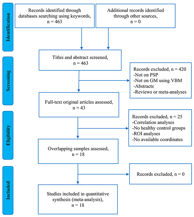 Major improvements in modern magnetic resonance imaging (MRI) techniques increase our ability to identify brain structural alterations in vivo that shed light on the neuroanatomical basis of PSP and hold promise for its diagnosis [4, 11-13]. Midbrain atrophy is a hallmark of PSP [12, 13]. Recent evidence from whole-brain voxel-based morphometry (VBM) studies in PSP has additionally demonstrated gray matter (GM) atrophy in a number of brain regions, such as the thalamus, basal ganglia, insula, frontal cortices, temporal cortices, parietal cortices, and cerebellum [13-31]. Compared with conventional MRI investigations that draw regions of interest (ROIs) for morphometric comparisons, VBM is a hypothesis-free analytic tool to quantify regional structural differences between groups at a whole-brain level [32]. VBM has been widely used in neurodegenerative disorders [33-35]. Despite the strengths, inconsistent results across different VBM studies were reported [13]. Shi, et al. in 2012, Shao, et al. in 2013, and Yu, et al. in 2014 thus conducted three coordinate-based meta-analyses to test the consistency of GM changes in PSP, which included nine, nine, and 12 VBM studies, respectively [36-38]. However, these meta-analyses had several limitations. First, these meta-analyses did not examine the confounding variables, such as age, gender, disease duration, and symptom severity that potentially lead to heterogeneity of the structural alterations associated with PSP [13]. Second, the quantitative voxel-based meta-analytic tools have been modified [39-41]. Several complementary analyses, such as jackknife sensitivity, heterogeneity, and publication bias analyses could be further performed to explore the robustness of the findings [42, 43]. Third, the numbers of VBM studies included in these meta-analyses were limited. To achieve sufficient power for moderate effects, Eickhoff and co-workers recently recommended that 17 or more experiments were needed for a coordinate-based meta-analysis to detect moderately sized effects [39]. In recent two years, we identified six more VBM studies of PSP eligibly for the meta-analysis. As such, results from previous meta-analyses cannot be considered conclusive and will need replication in a more exhaustive meta-analysis.