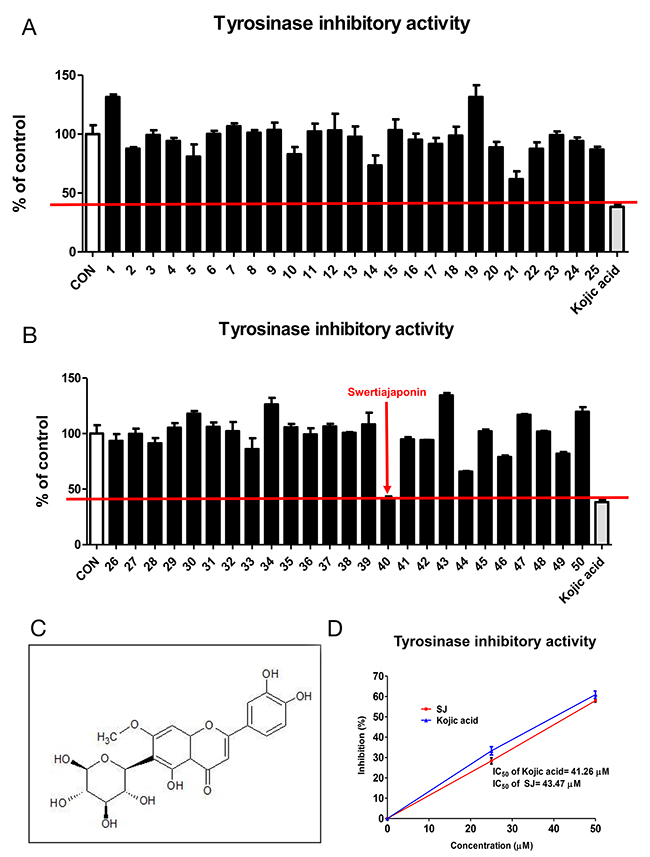 Figure 1: Swertiajaponin is the strongest tyrosinase inhibitors of fifty flavonoids. (A-B) The tyrosinase inhibitory activities of fifty flavonoids were measured using mushroom tyrosinase and L-tyrosine as a substrate. The inhibition percentage of kojic acid, a positive control, was used as selection criteria. (C) The structure of swertiajaponin was drawn using the ChemSketch software. (D) The inhibitory concentration 50% (IC50) of swertiajaponin and kojic acid was determined in the cell-free experiment using mushroom tyrosinase and L-tyrosine (n=3).