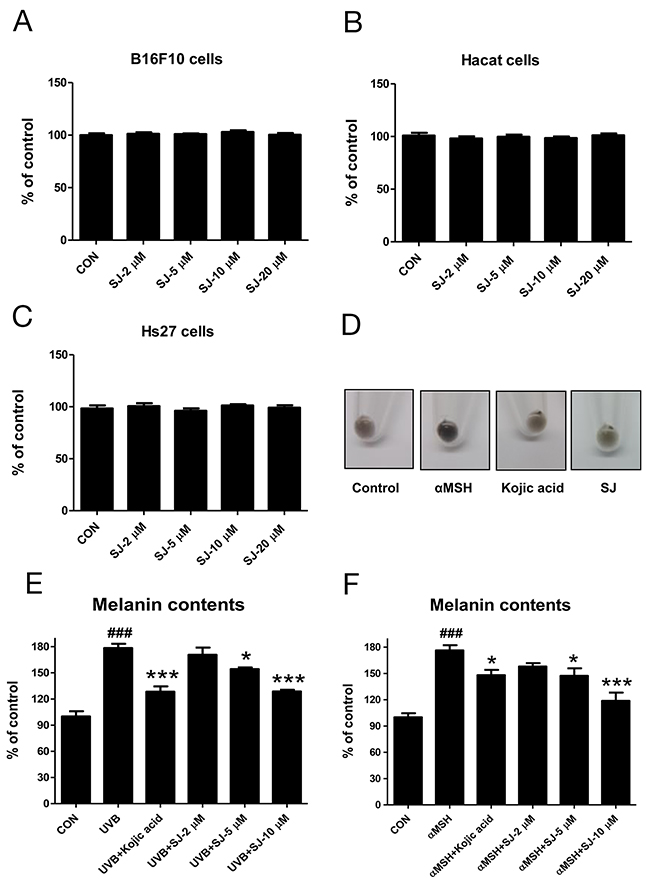 Figure 2: Swertiajaponin inhibits melanin level in B16F10 cells. Cell viability was examined in (A) B16F10, (B) HaCat, and (C) Hs27 cells treated with various doses of swertiajaponin (2-20 μM) for 48 h. The cytotoxicity was examined using a commercially available assay system (see methods for the detailed information). The data was shown as the percentages relative to the control group (non-treated group) (n= 3/group). B16F10 cells were pretreated with swertiajaponin or kojic acid for 1 h and the cells were stimulated with (D-E) αMSH (500 nM) or (D) UVB (10 mJ) for additional 48 h (n=4/group) with swertiajaponin or kojic acid treatment. The data are expressed as means ± SEM. Data were analyzed using one-way ANOVA followed by Dunnett’s test. ###P < 0.05 compared with the non-treated control group. *P < 0.05, **P < 0.01, and ***P < 0.001 compared to the α-MSH or UVB-treated group.