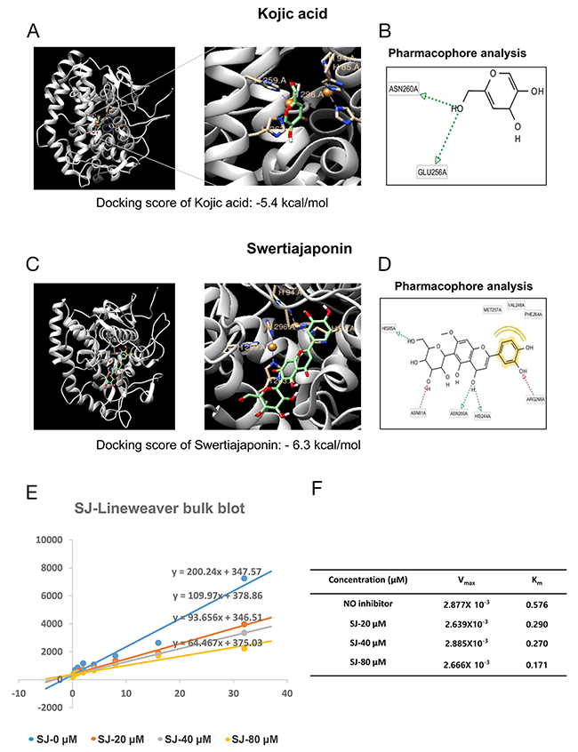 Figure 4: Swertiajaponin is a competitive inhibitor of tyrosinase. The binding affinity of (A) kojic acid or (C) swertiajaponin with tyrosinase (Agaricus bisporus, PDB ID:2Y9X) predicted by protein docking simulation using AutoDock Vina. LigandScout 3.1 software was applied to investigate binding residues of tyrosinase that interact with (B) kojic acid or (D) swertiajaponin. (E) The Lineweaver-Burk plot analysis was done to examine the mode of inhibition by swertiajaponin. (F) Km is the Michaelis–Menten constant and Vmax is the maximum reaction velocity based on Lineweaver–Burk plot analysis.