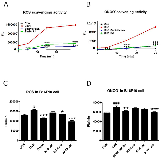 Figure 5: Swertiajaponin reduces UVB-induced oxidative stress in B16F10 cells. To test the anti oxidative effect of swertiajaponin, generation of (A) ROS and (B) ONOO- was measured in a cell-free system using fluorescent probes DCFDA and DHR123, respectively. Sin1 was used as a stimulator for ROS and ONOO- generation and Trolox and penicillamine were used as positive controls to scavenge ROS and ONOO-, respectively. (C-D) To investigate the anti oxidative function of swertiajaponin in B16F10 cells, the cells were pretreated with swertiajaponin (2-10 μM) for 1 h, followed by UVB exposure (10 mJ) for 30 min. Inhibition of intracellular levels of (C) ROS and (D) ONOO- are shown. The data are shown as the mean ± SEM. Data are analyzed using one-way ANOVA followed by Dunnett’s test: #P < 0.05 and ###P < 0.001 compared with the non-treated control group. **P < 0.01 and ***P < 0.001 compared to the Sin-1 or UVB-exposed group.