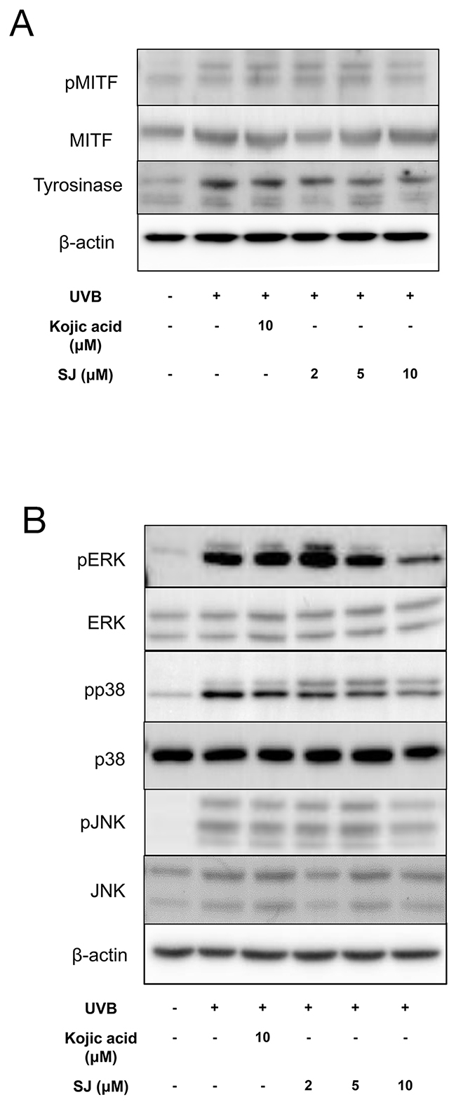 Figure 6: Swertiajaponin suppresses MAPK/MITF signaling in UVB-exposed B16F10 cells. B16F10 cells were pretreated with swertiajaponin or kojic acid for 1 h and the cells were stimulated with UVB (10 mJ) for additional 6 h for MAPKs or 48 h for MITF and tyrosinase with swertiajaponin or kojic acid treatment (n=4/group). Western blotting was performed to detect protein levels of (A) pMITF, MITF and Tyrosinse, and (B) pERK, ERK, pp38, p38, pJNK and JNK in B16F10 cells. β-actin was used as the loading control.