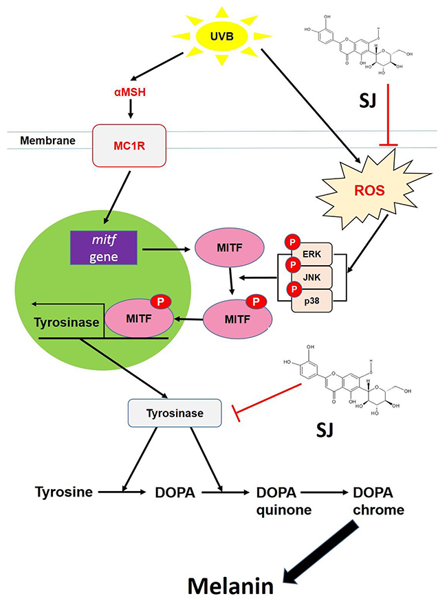 Figure 7: A hypothetical model of mechanisms underlying the swertiajaponin-mediated anti-melanogenic effect. The images showed that swertiajaponin inhibits tyrosinase by direct binding to the active site of the enzyme and by the anti oxidative effect followed by suppression of MAPK/MITF signaling. Thus, it inhibits tyrosinase gene expression as well as its activity. MC1R, melanocortin 1 receptor.