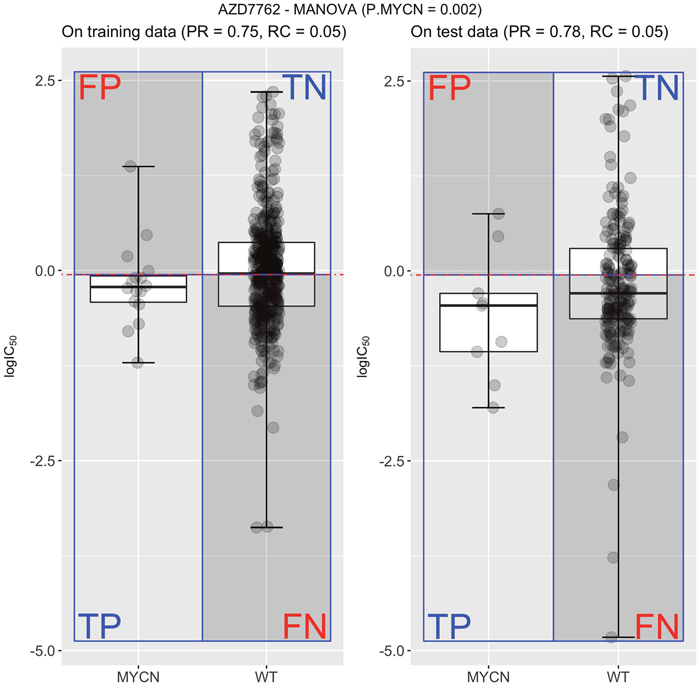 Figure 1: Measuring the performance of the most significant single-gene marker for the drug AZD7762. Using all the cell lines originally tested with this drug (the training set), MYCN-mutated cell lines were found to have increased sensitivity to AZD7762 (P=0.002)6. The median logIC50 in μM units of all cell lines in this training set (left) defines the sensitivity threshold (horizontal red line) for both training and test sets. Thus, this single-gene classifier predicts that cell lines harbouring the genetic aberration (mutated MYCN with boxplot named MYCN for short), tend to be more sensitive to AZD7762 (logIC50 below threshold) than cell lines that are wild-type (WT) with respect to the MYCN gene (boxplot marked as WT for short). This classifier achieves a high precision (PR=0.75) on the training set because only 25% of the cell lines that are predicted to be sensitive are actually resistant (false positives; FP). However, it obtains a very low recall (RC=0.05) as the vast majority of sensitive cell lines are WT with respect to MYCN and hence are incorrectly predicted to be resistant (i.e. false negatives; FN). A second scatter plot with two boxplots (right) shows the classification performance of the AZD7762-MYCN marker on the test set. It is similar to the performance obtained on the training set, which evidences the robustness of this particular marker.