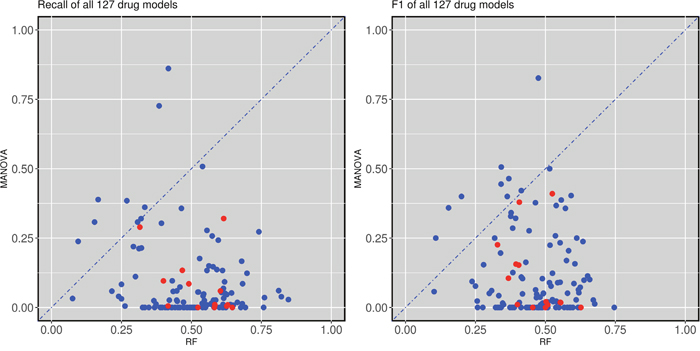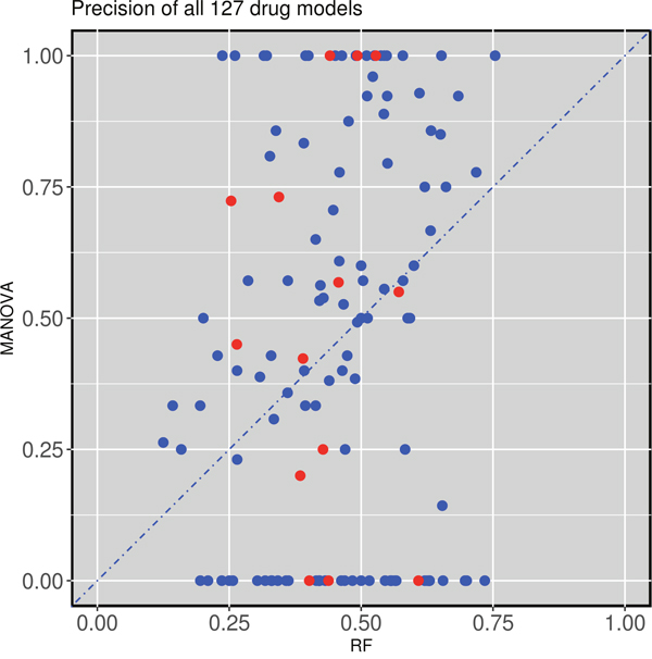 Figure 2: Test set precision of MANOVA single-gene markers versus RF multi-gene markers across 127 drugs. 62 drugs obtain better precision with the RF classifiers combining the 71 gene alterations, while 65 of the single-gene markers have higher precision. Cytotoxic drugs are red-coloured and targeted drugs are blue-coloured following the annotation of the original GDSC study.