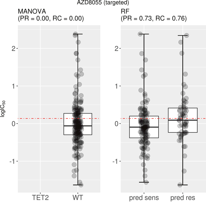 Figure 3: Best MANOVA single-gene marker versus RF multi-gene marker for AZD8055. Although the correlation is clear on the training set, the TET2 marker turned out to be of no use for the test set, as none of the test cell lines harbour mutations in the TET2 gene (no boxplot on the left). By contrast, the multi-gene marker is highly precise in identifying sensitive cell lines (PR=0.73) and does so with a high recall (RC=0.76). Note that the boxplot named “pred sens” shows the sensitivities of test set cell lines predicted sensitive, whereas the boxplot labeled “pred res” displays those for the test set cell lines predicted resistant.