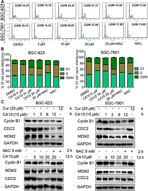 Figure 2: CA10 promotes ROS-dependent G2/M cell cycle arrest. (A) BGC-823 and SGC-7901 cells were treated with varying concentrations of CA10 for 16 h, and the cell cycle distribution was analyzed by flow cytometry. (B) Histogram illustrates the percentage of cell distribution at different cell cycle phases. The results were obtained from FACS analysis of three independent of experiments. (C) Immunoblot analysis of G2/M regulators including CDC-2, MDM-2 and Cyclin B1 at various time (1, 3, 6 and 12 h) and doses (5, 10 and 20 M) of CA10 exposure. Three independent experiments were performed and GAPDH was used as internal control.