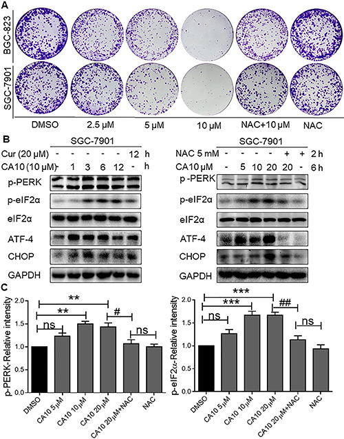 Figure 3: CA10 induces ROS-mediated growth inhibition and ER stress response. (A) BGC-823 and SGC-7901 cells were exposed to various concentrations of CA10 (2.5, 5 or 10 μM) or DMSO (vehicle control) for 24 h. Media was then replaced with fresh medium and culture continued for 7 days. Colonies were stained by crystal violet and then photographed. Three independent experiments were executed to view colonies formation. (B) BGC-823 and SGC-7901 cells were treated with CA10 for various time (0.5, 1, 2 and 3 h) and doses (5, 10 and 20 μM). Protein levels of p-PERK, p-EIF2α, ATF4 and CHOP were determined by western blotting. Representative of three independent experiments is shown. GAPDH and EIF2α were used as internal control. (C) Histogram data indicates the p-PERK and p-eIF2α expression by image J analysis of three independent experiments (*P < 0.01, ***P < 0.001 compared to the control group; #p < 0.05 ##p < 0.01 compared to the treatment group (CA10 20 μM).
