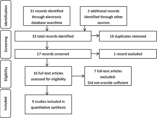 Our investigators independently conducted a systematic literature search in PubMed, Chinese National Knowledge Infrastructure (CNKI), EMBASE, WanFang (Chinese) Database, Chinese Biomedical Literature Database, and VIP (Chinese), with the last search update on January 1, 2017. We selected only studies in English and Chinese. We used the terms “(Gastric cancer) and (Matrix metalloproteinase 9)” or the equivalent Chinese terms to search the databases. In addition, we manually searched the reference lists of the included studies, as well as recent reviews, for further relevant studies (Figure 1).