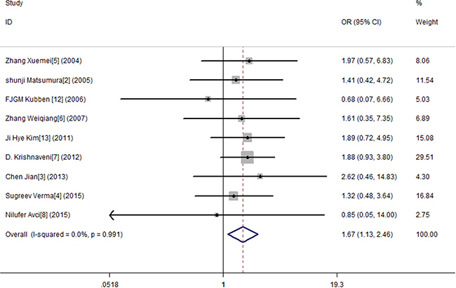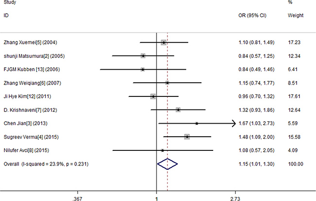Figure 2: Meta-analysis forMMP9-1562 C/T polymorphism and gastric cancer susceptibility in allele genetic model.
