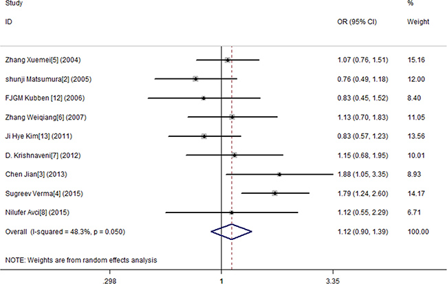 Recently, several studies have revealed that promoter polymorphisms of Matrix metalloproteinase-9, may contribute to gastric cancer in humans. The results by Japanese researchers in 2005 indicated that the T allele in the MMP-9 promoter is associated with the invasive phenotype of gastric cancer [3]. Recent studies performed by Chinese researchers in 2013 [4] and by Indian researchers in 2015 [5] have confirmed this result. In addition, these Chinese researchers [4] found that the genotype of MMP-9 is correlated with TNM classification and lymph node metastasis and plays an important role in the progression and metastasis of gastric cancer. In contrast to the abovementioned investigation, two additional studies published by Chinese researchers [6, 7], one additional study published by Indian researchers [8], and one study published by Turkish researchers [9] suggest no relevant association of MMP-9 with gastric cancer. Therefore, we conducted this meta-analysis to verify the association of MMP-9 SNPs with the risk of GC.