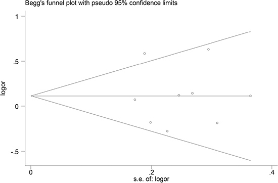 Figure 7: Funnel plots of the MMP-9 polymorphism studies: dominant model. No obvious funnel asymmetry was observed. Egger’s test of the value from the funnel plot showed no statistical significance (p = 0.917).