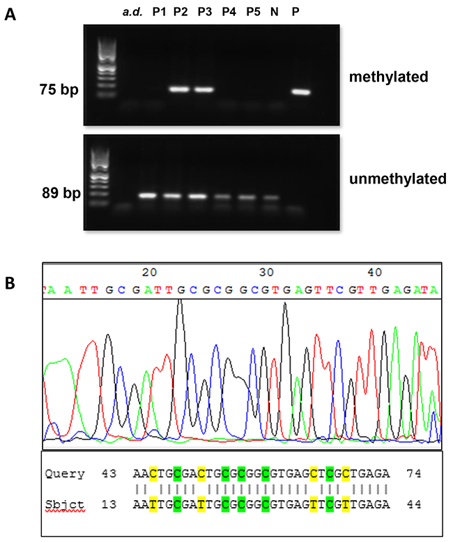 MS-PCR results were confirmed by Sanger Sequencing using 400ng of genomic DNA, which was modified by bisulfite treatment and further amplified as described above. 20μl of the amplified product were used for sequencing (GATC Biotech, Konstanz, Germany) with the same primers used for PCR for forward as well as reverse reactions. The results were interpreted using the National Center for Biotechnology Information (NCBI) Basic Local Alignment Search Tool (BLAST) and compared to the methylation-specific PCR (Figure 1B).