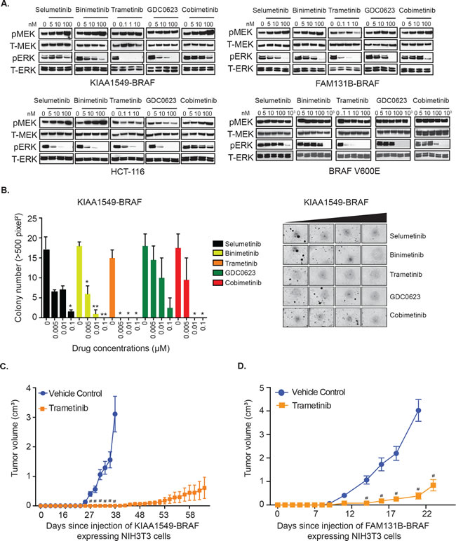 Figure 1: KIAA1549-BRAF and FAM131B-BRAF mediated activation of MAPK pathway and oncogenic transformation can be inhibited with MEK inhibitors. A. Stably expressing KIAA1549-BRAF, FAM131B-BRAF, and BRAF-V600E NIH3T3 cells and a HCT-116 RAS mutant cancer cell line were serum starved for 24 hours and then incubated with increasing concentrations of indicated drugs for 1 hour. Corresponding cell lysates were immuno-blotted with indicated antibodies. B. Stably expressing KIAA1549-BRAF cells were assayed for colony formation in soft agar and anchorage independent growth in the presence of increasing concentrations of drug. Colony number quantification (left): X-axis shows increasing drug concentrations for each cell line, and Y-axis is mean colony number count (with SEM of > 3 three different images) * p-value < 0.05, ** p-value < 0.01, *** p-value < 0.001; image (right) is representative of one replicate of soft agar assay. C., D. To assess in vivo tumor inhibition, C. KIAA1549-BRAF and D. FAM131B-BRAF NIH3T3 cell lines were injected into the flank of NSG immuno-deficient mice and treated daily with trametinib (0.33mg/kg/dose). X-axis shows days after injection and Y-axis is measured tumor volume in cm3 (with SEM of > 5 mice each treatment arm), # p-value < 0.0001 in trametinib treated versus vehicle control group.