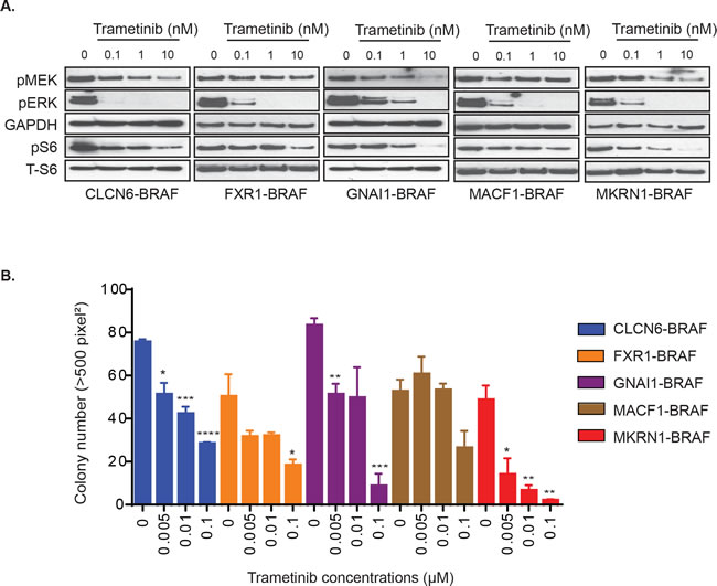 Figure 2: Varied effects of MEKi trametinib on various BRAF gene fusions. A. GNAI1-BRAF, MACF1-BRAF, MKRN1-BRAF, FXR1-BRAF, or CLCN6-BRAF expressing NIH3T3 cells were serum starved for 24 hours and then incubated with increasing concentrations of drug for 1 hour. Corresponding cell lysates were immuno-blotted with indicated antibodies. B. BRAF-fusion expressing NIH3T3 were assayed for colony formation in soft agar and anchorage independent growth in the presence of increasing concentrations of drug. Colony number quantification as before (with SEM of > 3 three different images); * p-value < 0.05, ** p-value < 0.01, *** p-value < 0.001.