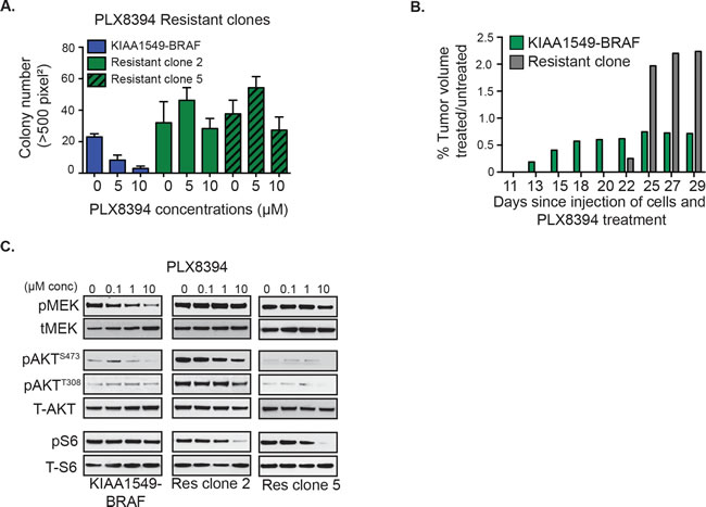 Figure 4: Emergent resistance to ‘paradox-breaking’ RAFi PLX8394 is mediated by PI3K/AKT/mTOR pathway activation. A. Stably expressing KIAA1549-BRAF fusion cells and PLX8394 resistant cells were incubated with drug in soft agar and colony formation measured. X-axis shows increasing drug concentrations for each cell line, and Y-axis is mean colony number count (with SEM of n > 3). B. Comparisons of tumor volumes in KIAA1549-BRAF-fusion NIH3T3 parental cells versus PLX8394 resistant clone (graph: mean treated tumor volume divided by mean untreated tumor volume). C. Stably expressing KIAA1549-BRAF-fusion cells and PLX8394 resistant clones were incubated in increasing concentrations PLX8394 and lysates were immuno-blotted as indicated.