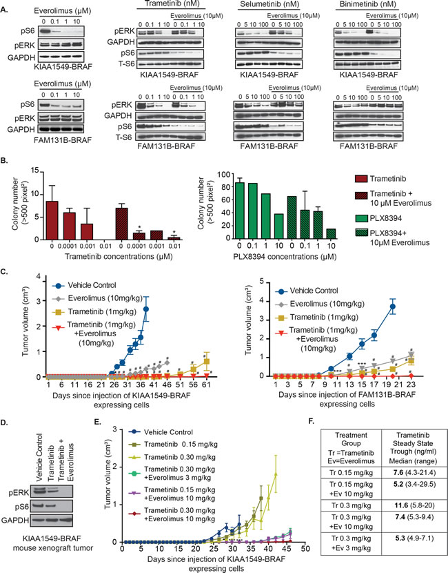 Figure 5: Combinatorial targeting of MEK and mTOR against BRAF-fusion displays enhanced targeting efficacy in vitro and in vivo. A. Immunoblots of KIAA1549-BRAF expressing cell lines treated with increasing concentration of trametinib or everolimus as single agents and in combination. B. Anchorage independent growth of stably expressing KIAA1549-BRAF cells in the presence of increasing concentrations of trametinib as single-agent and with everolimus (left panel) and PLX8394 as single-agent and with everolimus (right panel). X-axis shows increasing drug concentrations and Y-axis is mean colony number count (with SEM of > 3 three different images), *p-value < 0.05. C. KIAA1549-BRAF and FAM131B-BRAF expressing cell lines were injected into the mice flanks and treated daily with trametinib, everolimus or combination of trametinib with everolimus. X-axis shows days after injection and Y-axis is measured tumor volume in cm3 (with standard error mean). D. Immuoblot of KIAA1549-BRAF mouse tumor lysates from panel D assessing on-target effect of inhibitors. E. KIAA1549-BRAF expressing cell lines were injected as flank xenografts and mice treated daily with lower doses of trametinib and everolimus as indicated (n = 10, SEM values shown). For mouse experiments, * p-value < 0.05, ** p-value < 0.01, *** p-value < 0.001 and # p-value < 0.0001 between vehicle control and respective treatment group.