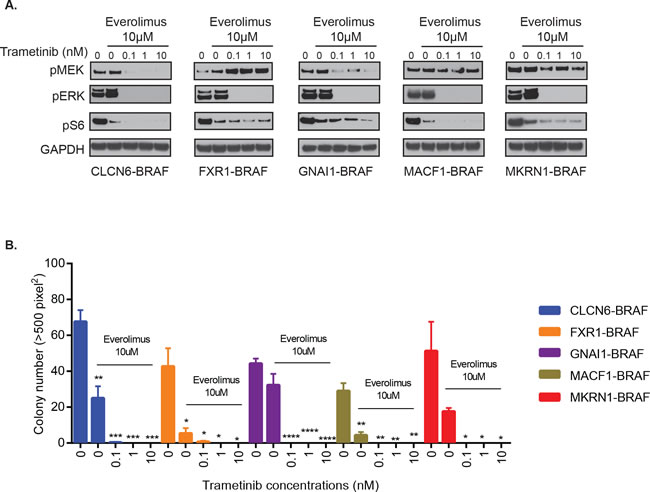 Figure 6: Combinatorial treatment of additional BRAF-fusions with MEKi and mTORi shows inhibition of signaling and oncogenic growth. A. GNAI1-BRAF, MACF1-BRAF, MKRN1-BRAF, FXR1-BRAF or CLCN6-BRAF expressing NIH3T3 cells were exposed to indicated inhibitors for 1 hour and subjected to western blot analysis. B. Stably expressing BRAF-fusion lines were assayed for colony formation in soft agar in the presence of increasing concentrations of trametinib and 10µM everolimus. Colony number quantification (left): X-axis shows increasing drug concentrations for each cell line, and Y-axis is mean colony number count (with SEM of > 3 three different images), *p-value < 0.05 to 0.0001.