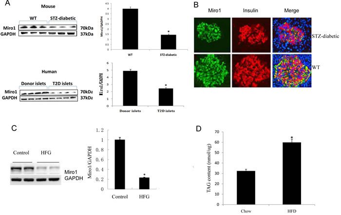 Figure 1: A. The protein level of Miro1 in islet samples from diabetic mouse model and biopsy patients with T2D. Miro1 expression was normalized to that of GAPDH (n = 4 for normal and 7 for T2D samples, *P < 0.05 versus control). B. The distribution of the Miro1 within islet cells from STZ-diabetic mouse model was analyzed using confocal microscopy. C. Miro1 protein expression in the islet of mice subjected to an HFD for 24 weeks and in NC controls (n = 5 samples per experimental group, *P < 0.05 compared with the NC group). GAPDH served as a loading control D. TAG contents in the islet of mice subjected to an HFD for 24 weeks and in NC controls (n = 6 samples per experimental group, *P < 0.05 versus control). The data represent as the mean±SD. Statistical analysis was carried out by Student’s two-tailed t-test.