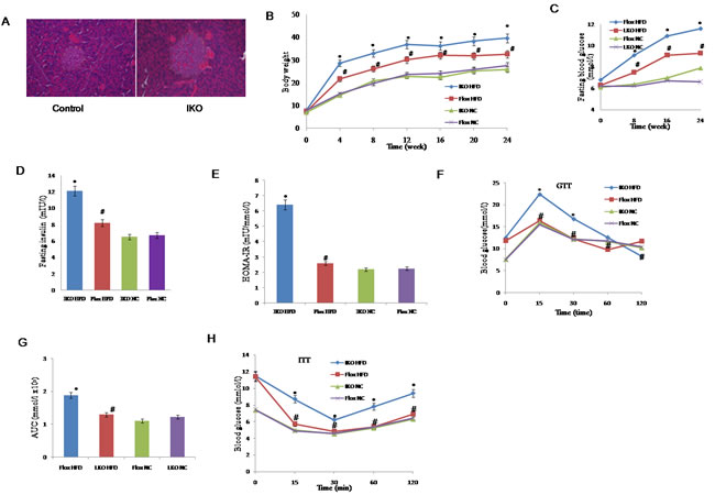 Figure 2: A. Haematoxylin and eosin staining of islet sections of IKO and floxed controls. B. Changes in the body weight of IKO and floxed mice treated with an HFD or NC for 24 weeks (n = 13-18 for each group per time point). C.-E. FBG, FINS and HOMA-IR in IKO or floxed mice treated with an HFD or NC for 24 weeks. FBG levels were measured every 4 week C. FINS was measured at the end point of this experiment D. HOMA-IR was calculated as HOMA-IR = (FBG (mmol l−1) × FINS (mIU l−1))/22.5 (n = 7-13 for each group per time point) E. F. Intraperitoneal glucose tolerance test (GTT) (1 g kg−1). G.The corresponding area under the curve (AUC) of blood glucose level was calculated (n = 7-9 for each group). H. Intraperitoneal insulin tolerance test (ITT; 0.75 units per kg) was performed on floxed and IKO mice at the 22nd or 23rd week of food administered, respectively. For A-H, *P < 0.05 compared with the corresponding floxed/NC group; #P < 0.05 compared with the corresponding floxed/HFD group. All values are means±SD. Significance determined by two-way analysis of variance with general linear model procedures using a univariate approach A.-D., G. and Student’s two-tailed t-test E., H.