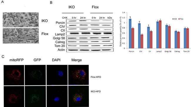 Figure 3: A. Electron microscopic analysis of mitochondria showed mitochondrial fragmentation in IKO mice compared with floxed mice. B. Protein degradation rates were measured in islet cells from IKO and floxed mice at 0 and 24 h of treatment with 10 mg/ml cycloheximide (CHX). Level of the mitochondrial proteins was analyzed using antibodies against porin, SDHA subunit of complex II (CII), ATP synthase (CV), and Tom20. Golgi apparatus, lysosomes, and endoplasmic reticulum were analyzed using Golgi58, Lamp2, and calregulin (calreg) antibodies. Quantification of protein levels after 24 h CHX treatments on islet cells was showed in down panel. Blue bars are IKO, and red bars are floxed. Values are percentage of respective protein amount at t = 0 (n = 3). Dashed line represents value at t = 0 and normalized to 100% for each protein. *p < 0.05, ***p < 0.001. Data are presented as mean ± SD. C.The co-localization of mito-RFP with GFP was observed using confocal microscopy. Cell nuclei were stained with DAPI, and fluorescence signals were visualized by confocal immunofluorescence microscopy. Green fluorescence indicates autophagosomes, and red fluorescence indicates mitochondria.