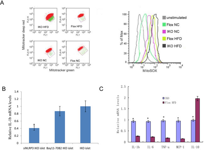 Figure 4: A. Islet cells from IKO and floxed mice under HFD/NC treatment were grown for 6 h and then stained with Mitotracker green and Mitotracker deep red or MitoSOX for 30 min and analyzed by flow cytometry. B.The IL-1b mRNA expression levels treated by siNLRP3 and Bay11-7082. C. Relative mRNA expression levels of the proinflammatory cytokines TNF-α, IL-1β, IL-6, IL-10 and MCP-1 were determined by qRT-PCR in islets from IKO and floxed mice. Mean±SD from 3 independent experiments, analyzed by one-way ANOVA following Newman-Keuls post hoc test. **,P < 0.01 compared to the control groups.