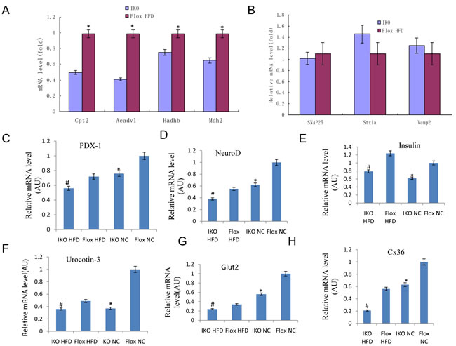 Figure 5: A.-B. RT-qPCR of mitochondrial function related genes Cpt2, Acadv1, Hadhb, and Mdh2 A. and unrelated genes SNAP25, Stxla, and Vamp2 B. in isolated islets. C.-H. mRNA level of genes PDX-1, NeuroD, Insulin, Glut2, Urocortin-3, and Cx36 involved in beta cell function and communication in islets from IKO and Floxed mice either on chow or HFD. mRNA level of each gene was normalized to 18S rRNA level in the same sample. Mean ± SD, n = 6 per group. *p < 0.05 flox-NCD versus IKO-NCD or flox-NCD versus flox-HFD; **p < 0.01 flox-NCD versus IKO-NCD or flox-NCD versus IKO-HFD; #p < 0.05 flox-HFD versus IKO-HFD.