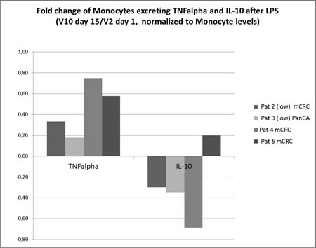 Figure 2: Fold change of Monocytes excreting TNF alpha and IL-10 after Lipopolysaccharide induced cytokine release. Enhanced TNF/IL-10 ratio in four patients analyzed showing pro-inflammatory potency (TNF release) of peripheral blood monocytes following TLR-4 stimulation increased over the observation time while the anti-inflammatory potency (IL-10 release) decreased (mean: 3.73 fold, range 1,32 - 6,01 fold).