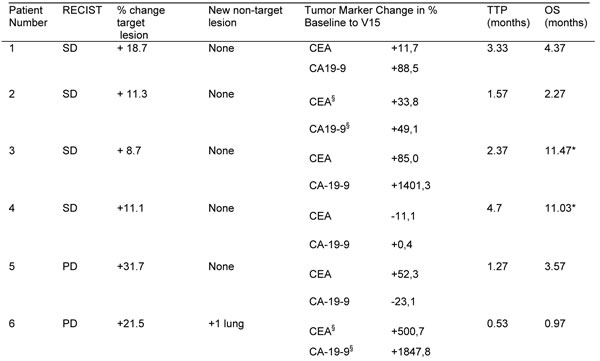 There were no RECIST-type responders observed in this study, 4/6 pts achieved stable disease, while 2/6 suffered from progressive disease. As far as tumor and serum markers were collected, a trend towards stable values during the treatment but rising markers between completion of treatment and post-intervention staging evaluation was notable. The informative value of efficacy data is limited by sample size, heterogeneity and the fact that last line patients partly far beyond standard therapy were recruited for this study.