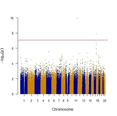 Figure 1: The Manhattan plot of genome-wide association of single nucleotide polymorphisms (SNPs) with the metabolic syndrome. The Manhattan plot was constructed using the P values of SNPs, which was generated via logistic regression after adjustment for covariates including age and sex. The individual SNP is represented by a point, with higher points (higher negative log10 P values) indicating more significant association. The red horizontal line is the genome-wide significance level (P = 8.6 × 10-8), and points above the red horizontal line indicate SNPs with a P value of less than 8.6×10−8. Y-axis: -log10 (P value) of each SNP; X-axis: chromosomes labelled with blue and orange colors.
