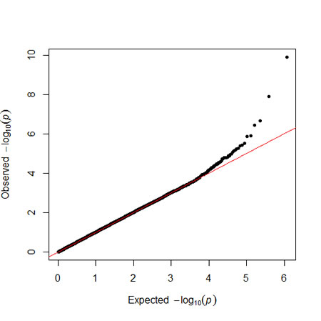 Figure 2: The QQ-plot of metabolic syndrome results. The plots show observed and expected distributions of P-values from the genome-wide association study of the metabolic syndrome.