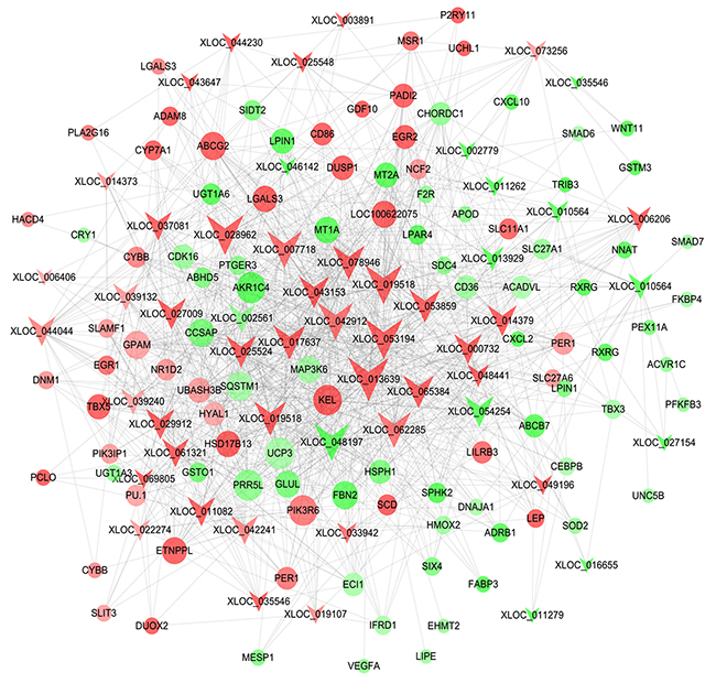 Figure 5: Co-expression network of the differentially expressed lncRNAs and genes related to lipid metabolism. Note that color denotes differential expression levels. Red represents up-regulation and green represents down-regulation. Size represents the importance of a node (Degree). The edge denotes the interaction strength. Circles and inverted triangles represent genes and lncRNAs, respectively.