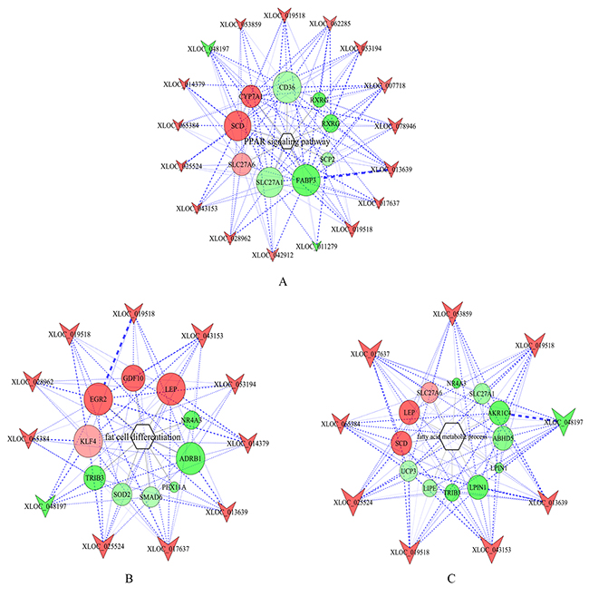 Figure 6: LncRNA-gene-pathway network related to lipid metabolism. (A) lncRNA-gene-PPAR signaling pathway network. (B) lncRNA-gene-fat cell differentiation network. (C) lncRNA-gene-fatty acid metabolism process network. Hexagons, circles and inverted triangles represent pathways, genes and lncRNAs, respectively. Note that color denotes differential expression levels. Red represents up-regulation, and green represents down-regulation. Size represents the importance of a node (Degree). The edge denotes the interaction strength.
