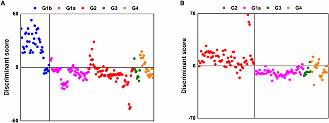 Figure 1: Separation results using PCA-DA with all LMIs. (A) Group 1b vs. groups of 1a/2/3/4. (B) Group 2 vs. groups of 1a/3/4.
