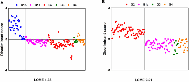A total of 10,905 LMIs were used for the Low-Mass ion discriminant Equations (LOMEs). The results for the discriminants for Group 1b vs. groups of 1a/2/3/4 (sensitivity, 83%; specificity, 85%) and Group 2 vs. groups of 1a/3/4 (sensitivity, 85%; specificity, 91%) using PCA-DA are presented in Figure 1A and 1B, respectively. All LMIs in the logarithmic peak table contributed to the PCA-DA discriminant scores (DSs).