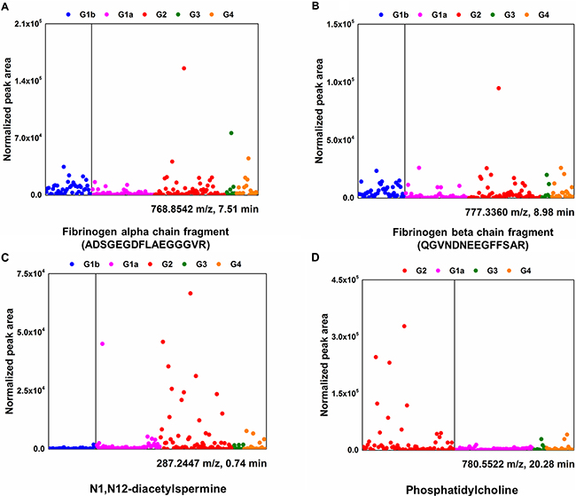 Fibrinogen fragment is also associated with inflammation and cancers. Up-regulation of fibrinogen production in blood can be a useful prognostic factor in various types of cancers (e.g., ovarian [24], bladder [25], lung [26], renal [27], and colorectal [11]). Increased CSF fibrinogen levels have not been reported for solid cancer metastases, but deranged levels have been found in CSF from children with leukemia [28]. We identified fibrinogen alpha (ADSGEGDFLAEGGGVR) and beta (QGVNDNEEGFFSAR) fragments in CSF. Differential levels of both metabolic peptides in CSF might be useful for discriminating CNS tumor free patients with systemic cancer (Group 1a) from other groups of patients.