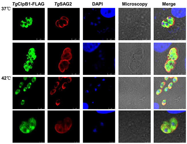 HFF cells infected with T. gondii were fixed with 4% paraformaldehyde for 30 min and then permeablized with 0.03% Triton X-100 in PBS at 4°C for 10 min. The cells were washed in PBS three times and blocked with 3% bovine serum albumin (BSA) at room temperature for 1 h. TgClpB1, TgClpB2 and TgClpB3 were detected with mouse polyclonal anti-FLAG M2 primary antibody and secondary antibodies conjugated to Alexa Fluor 488 fluorescent (life technology). TgSAG2 protein was detected by rabbit polyclonal anti-TgSAG2 and Alexa Fluor 647 conjugated goat anti-rabbit IgG. TgPRX3-HA as T. gondii mitochondria marker and TgACP-HA as an apicoplast marker. Both were detected with mouse anti-HA primary antibody and a secondary antibody conjugated to Alexa Fluor 647 fluorescent (life technology), respectively. Nuclei were visualized with 4’, 6-diamidino-2-phenylindole (DAPI) stain. Cells were mounted with ProLong Diamond Antifade Mountant (Thermo Fisher Scientific). The samples were imaged using confocal laser-scanning microscopy (Leica).