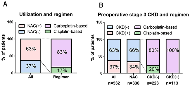 Except for age, there were no significant differences in preoperative patient characteristics between the Ctrl and NAC groups (Table 1). Most patients in the NAC group were administered with a carboplatin-based regimen (83%). The regimens in the NAC group were gemcitabine plus carboplatin (GCarbo) in 280 patients (83%), gemcitabine plus cisplatin (GCis) in 43 patients (13%), and others (MVAC; methotrexate, vinblastine, doxorubicin, and cisplatin or a docetaxel-based regimen) in 13 (3.9%) patients (Figure 2A). Of 532 patients, the number of patients presented with and without preoperative stage 3 chronic kidney disease (CKD) was 195 (37%) and 337 (63%), respectively. Among the patients with NAC, 223 of 336 (66%) did not present with stage 3 CKD. Of these 223 patients with NAC, who did not present with stage 3 CKD, 179 patients (80%) were administered with carboplatin-based regimens (Figure 2B). The number of patients treated in 1994-2004 and 2005-2016 were 134 (25%) and 398 (75%), respectively. The number of patients treated in 1994-2004 in the Ctrl and NAC groups were 120 (61%) and 14 (4.2%), respectively (P < 0.001). The number of patients who underwent postoperative chemotherapies for metastatic disease were significantly higher in the Ctrl group (n = 58, 30%) than in the those of NAC group (n = 61, 18%, P = 0.002).